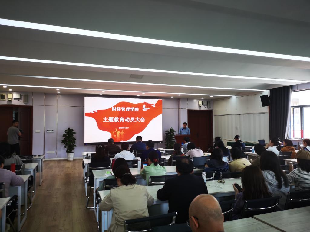 4月27日下午,财经管理学院在10-412召开学习贯彻习近平新时代中国特色社会主义思想主题教育动员大会,深入贯彻学校党委主题教育工作会议精神,动员部署学院主题教育工作,推动全院上下用党的创新理论统一思想、统一意志、统一行动,汇聚新时代学院改革发展的磅礴力量。学院党总支谢鑫书记作动员讲话。谢鑫书记对学院主题教育进行了全面动员和安排部署。他指出,一是坚持学深悟透,充分认识开展主题教育的重大意义。做到四个“深......