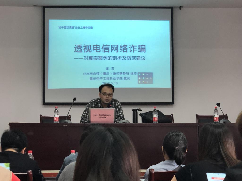 为进一步加强服务型党组织建设,2019年5月15日,财经管理学院专业基础部党支部书记邓满、教师党员谢宏、罗觅嘉以及会计系党支部教师朱红英,与重庆市渝中区社会教育学院携手开展“渝中智汇课堂”走进上清寺街道活动。谢宏老师以“透视电信网络诈骗——对真实案例的剖析及防范建议”为题,为社区居民举办了一场生动、贴近生活的普法讲座。持续1个半小时的讲座中,谢老师首先对“什么是电信网络诈骗”进行讲解,接着通过其经......