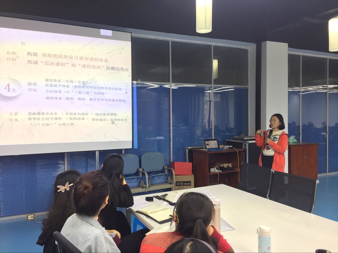 为进一步贯彻落实学校党委《关于印发“大思政”教育工作责任清单的通知》(重电党〔2018〕82号)文件精神,积极构建“大思政”育人格局,大力提升学院思想政治工作质量,2018年10月18日下午16:00,财经管理学院在10栋404教室举办了复旦大学“大思政”专题培训学习交流会,学院全体教职工参加此次会议。本次交流会由复旦大学“大思政”专题培训参培学员,财经管理学院教师刘盈含主讲。刘老师从“大思政”教育的背景、“......