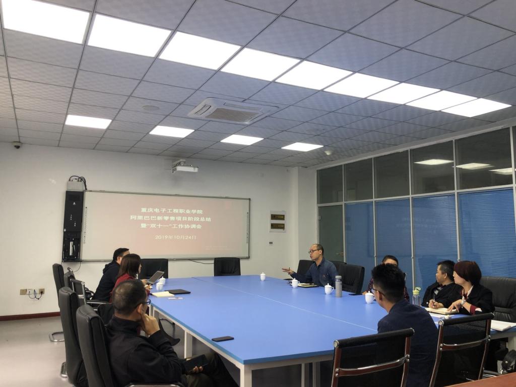 2019年10月24日,重庆电子工程职业学院阿里巴巴新零售项目阶段总结暨“双十一”工作协调会在学校10-402会议室召开。阿里巴巴校企项目负责人王娜、阿里巴巴重庆电子工程职业学院新零售人才孵化基地运营团队负责人严治平以及财经管理学院黄志平院长、汪启航副院长、电子商务系董征宇主任、合作发展部王希琼主任以及双方驻场教师出席了会议。 首先,运营团队负责人严治平老师从项目简介、运营数据、典型案例、学生个人发展等方......