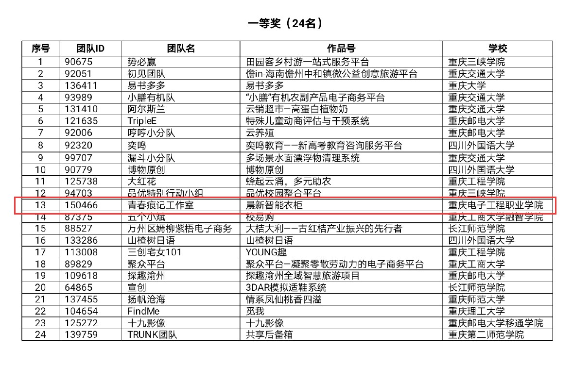 第十届全国大学生电子商务“创新、创意及创业”挑战赛重庆市赛区总决赛于7月12日举行,经过层层选拔,我院电子商务专业2019级学生罗倩、冷俊霖、谭冰可、蒋晓璇、刘霞团队的项目《晨新智能衣柜》经过答辩,最终获得重庆市赛区总决赛一等奖,是唯一获得一等奖的职业院校,也是我校参赛以来的最好成绩。全国大学生电子商务“创新、创意及创业”挑战赛是由全国电子商务创新产教联盟主办,本次重庆市赛区总决赛由重庆市教育委员会......