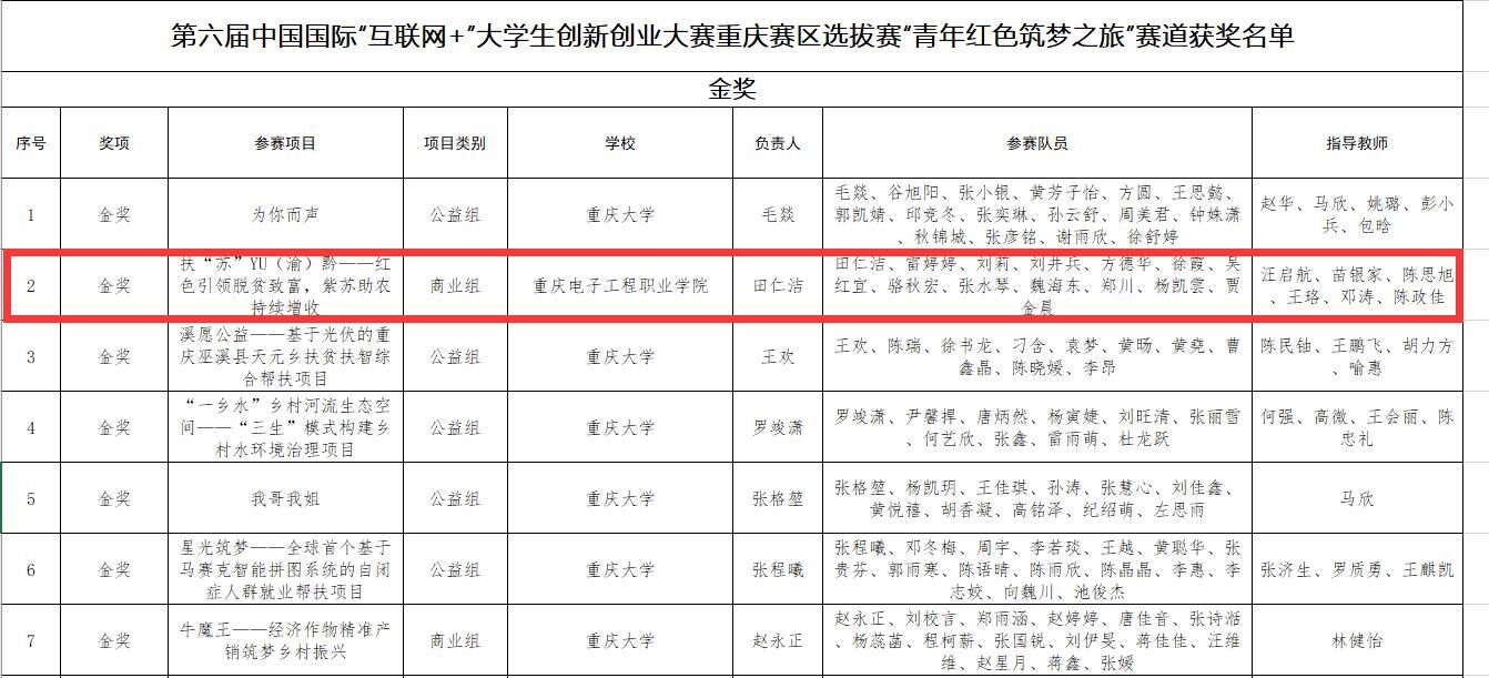 2020年8月25日至26日,由重庆市教育委员会主办,由重庆大学和璧山区人民政府承办的第六届中国国际“互联网+”大学生创新创业大赛重庆赛区选拔赛决赛采用网络答辩方式举行。财经管理学院进入市赛的项目最终获得金奖2项,银奖3项的好成绩。《扶“苏”YU(渝)黔——红色引领脱贫致富,紫苏助农持续增收》和《“桶”逸智健——5G家庭智能健康日常检测专家》等两个项目斩获市赛金奖,其中《扶“苏”YU(渝)黔——红色引领脱贫致富......
