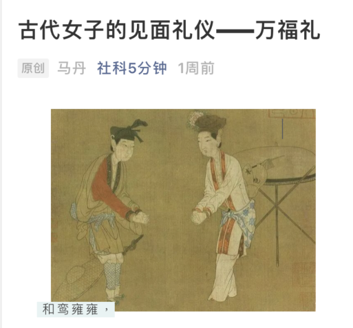 近日,财经管理学院“六艺”素质赋能课程组在由重庆市社科联制作出品的微信公众号“社科五分钟”开展了“古代女子的见面礼仪-万福礼”的线上科普,吸引了300多人次网友阅读关注,收获“在看”和“赞”共计90余次,产生了较好的科普传播效果。为弘扬中华传统文化,以“六艺”素质赋能专业教学,财经管理学院“六艺”素质赋能课程组积极开展教学实践、社会科普。后续,“六艺”素质赋能课程组还将在“社科五分钟”公众号开展更多......