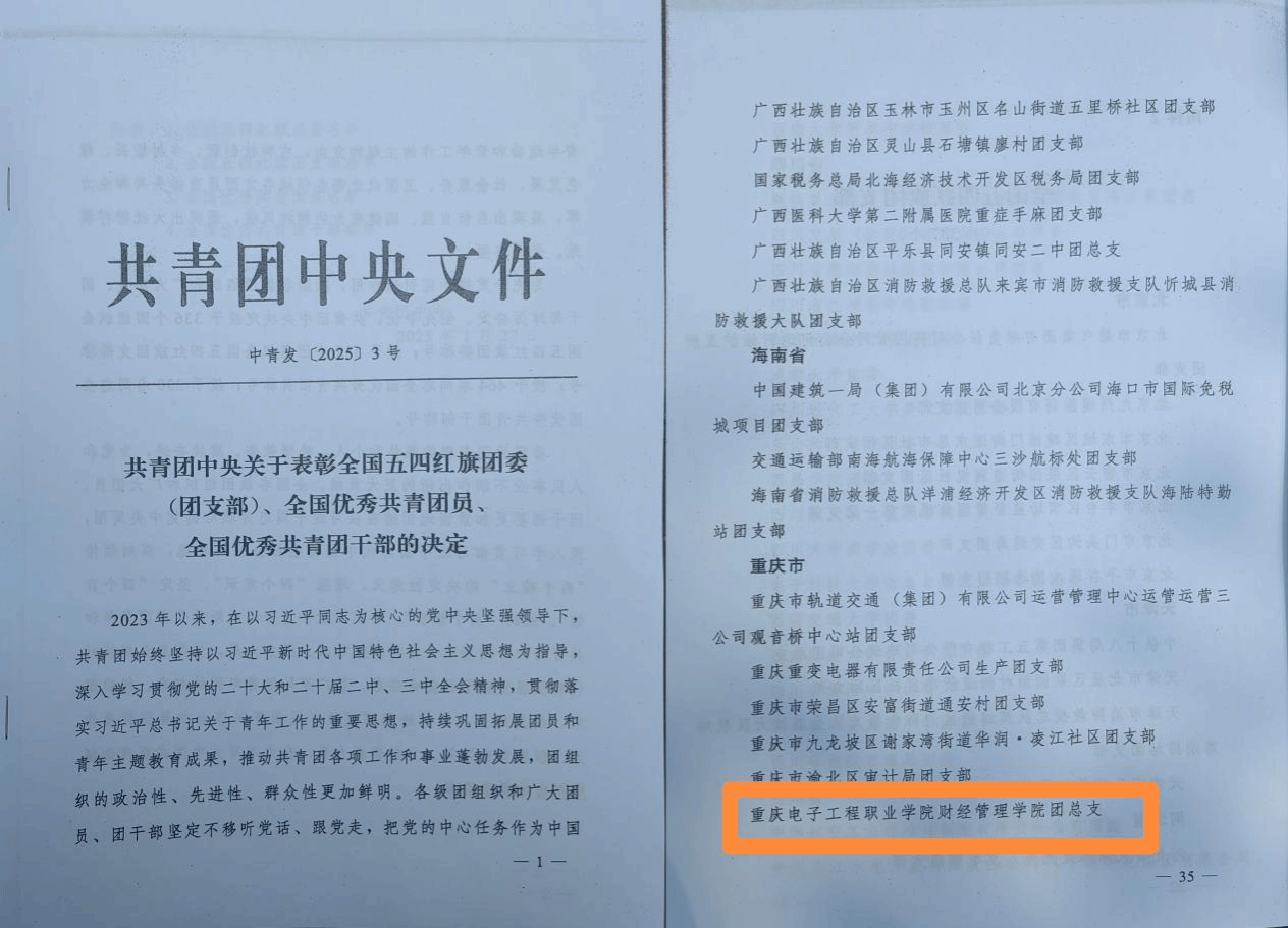 近日,共青团中央发布中青发〔2025〕3号文件,《共青团中央关于表彰全国五四红旗团委(团支部)、全国优秀共青团员、全国优秀共青团干部的决定》。其中全国五四红旗团委(团支部),全重庆市高校仅获评2个,重庆电子科技职业大学财经管理学院团总支榜上有名。财经管理学院团总支始终坚持以习近平新时代中国特色社会主义思想为指导,全面贯彻党的教育方针,深入学习贯彻党的二十大精神、习近平总书记关于青年工作的重要思想,落实立德树人的根本任务。......