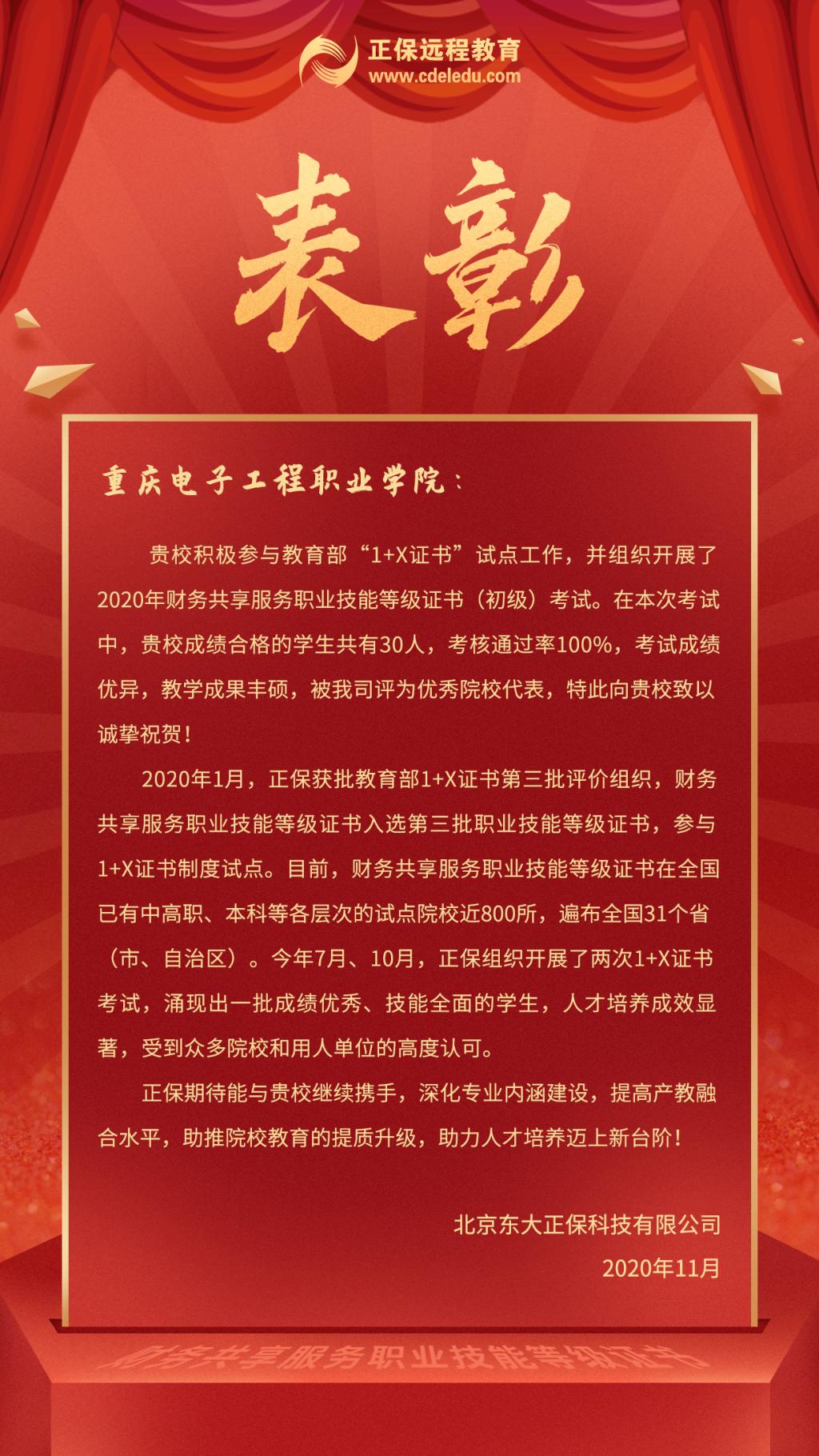 学院作为重庆市1+X财务共享服务职业技能等级证书考核站点,与培训评价组织—北京东大正保科技有限公司密切合作,积极参与1+X财务共享服务师生培训认证工作。2020年度共组织两次考评工作,各有30名同学参加且通过率均为100%,远超全国通过率79%。参加考评的学生表示,此次考评是对自身职业教育阶段所学知识的一次检验,通过强化培训和学习,使自己进一步梳理了知识结构,提升实操技能,熟悉了专业领域的云核算、云税务和财务机器人等新技术,积累了国家学分银行认可的学分,赢得了北京东大正保科技有限公司为高分学员提供的精英计划实习机会,提高了就业竞争优势。