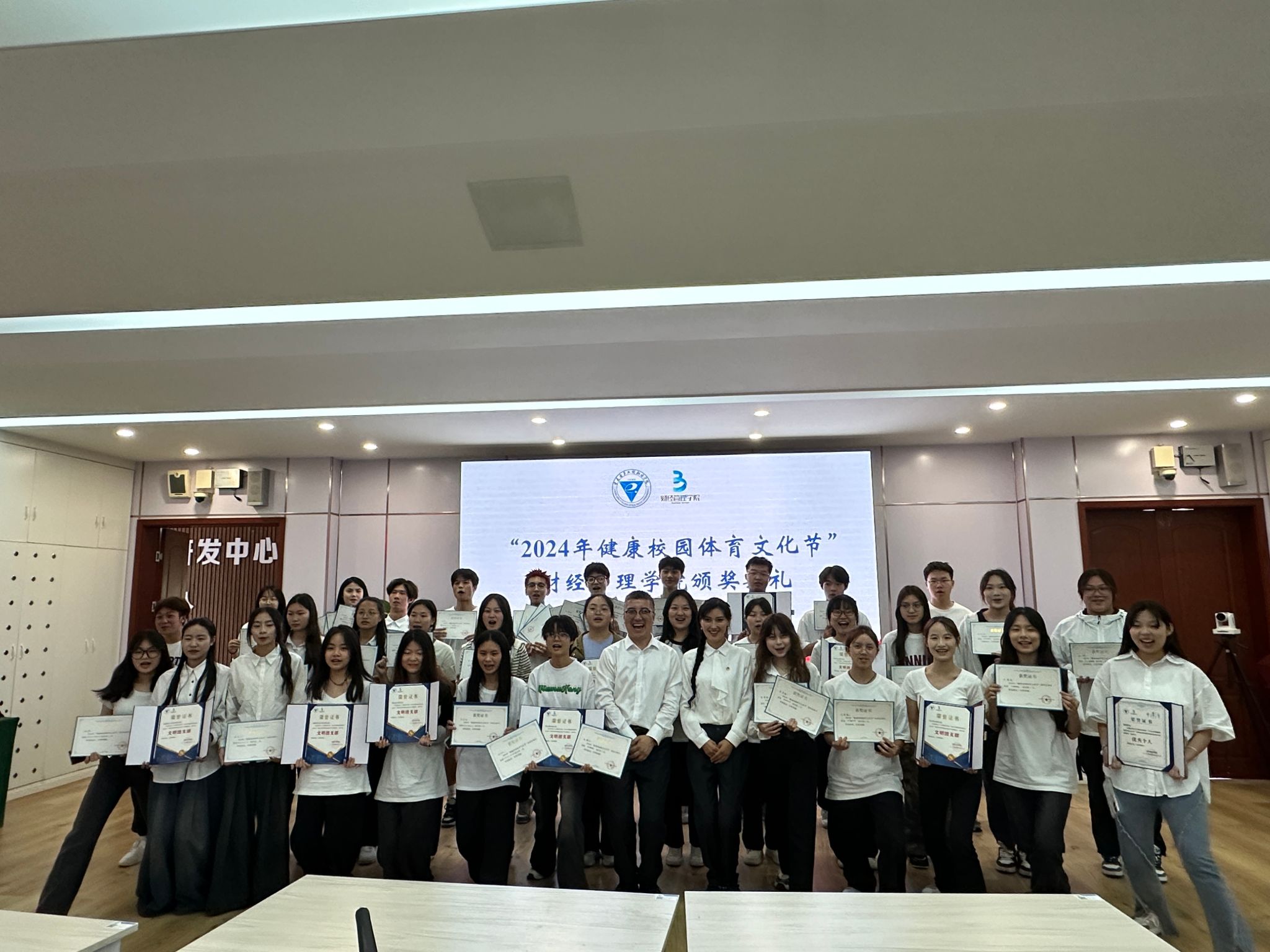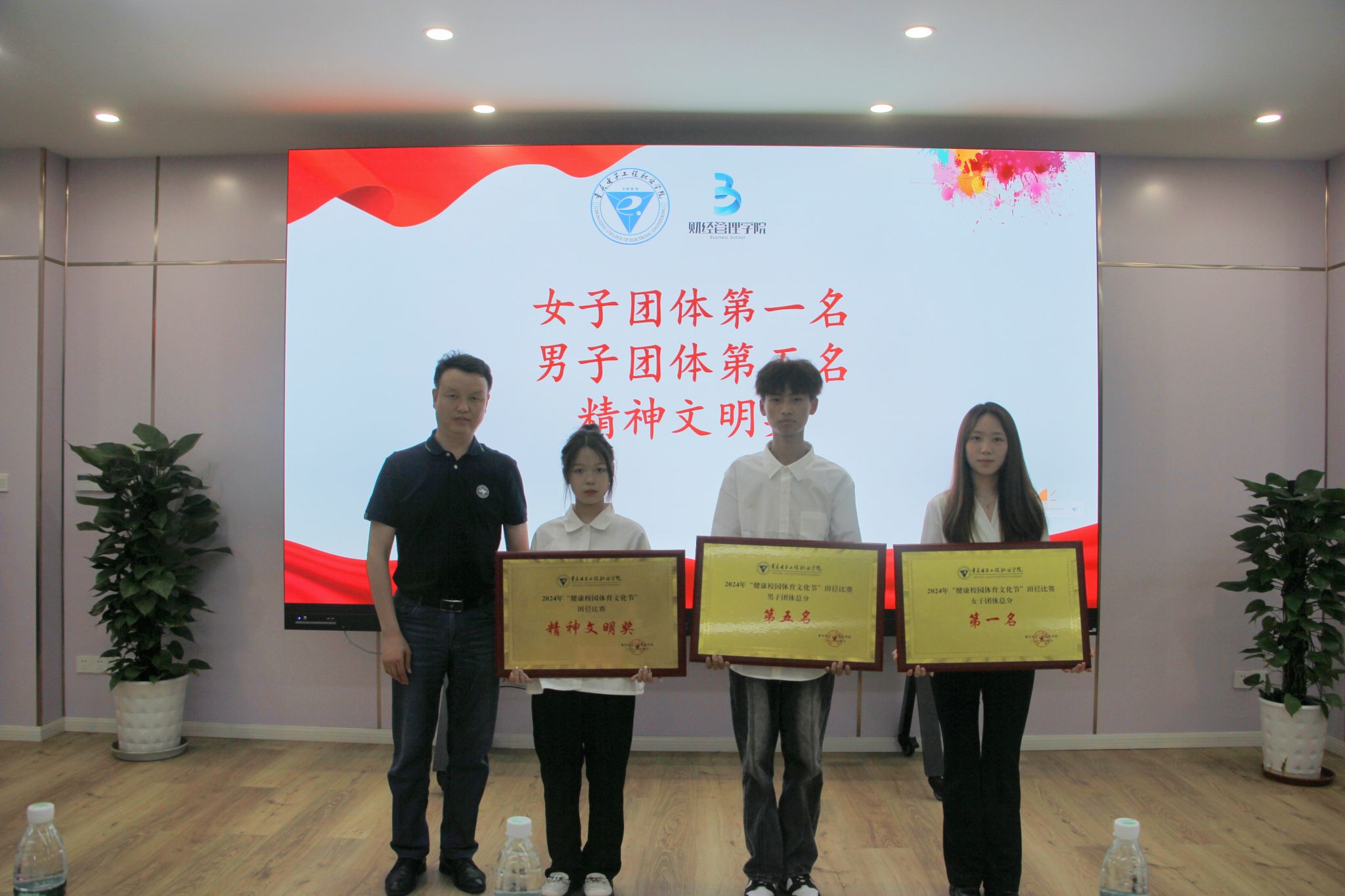经过三天的激烈比拼,运动会已落下帷幕。学院取得教职工团体第三名,学生女子团体第一名,学生男子团体第五名的好成绩,并获得精神文明奖。与此同时,4月19日,学院在10-412会议室举行“2024年健康校园体育文化节”财经管理学院田径运动会颁奖典礼,学院党总支书记蒋斌向各位参赛运动员取得的成绩表示祝贺,同时也感谢了本次运动会幕后工作人员的辛勤付出,他鼓励同学们继续发扬体育精神,将体育精神融入生活点滴,打造积极向上、勇敢坚毅的学院氛围。随后,主持人宣布获得文明团支部、优秀个人、优秀运动员表彰决定,老师们为获奖学生代表颁奖并合影留恋。