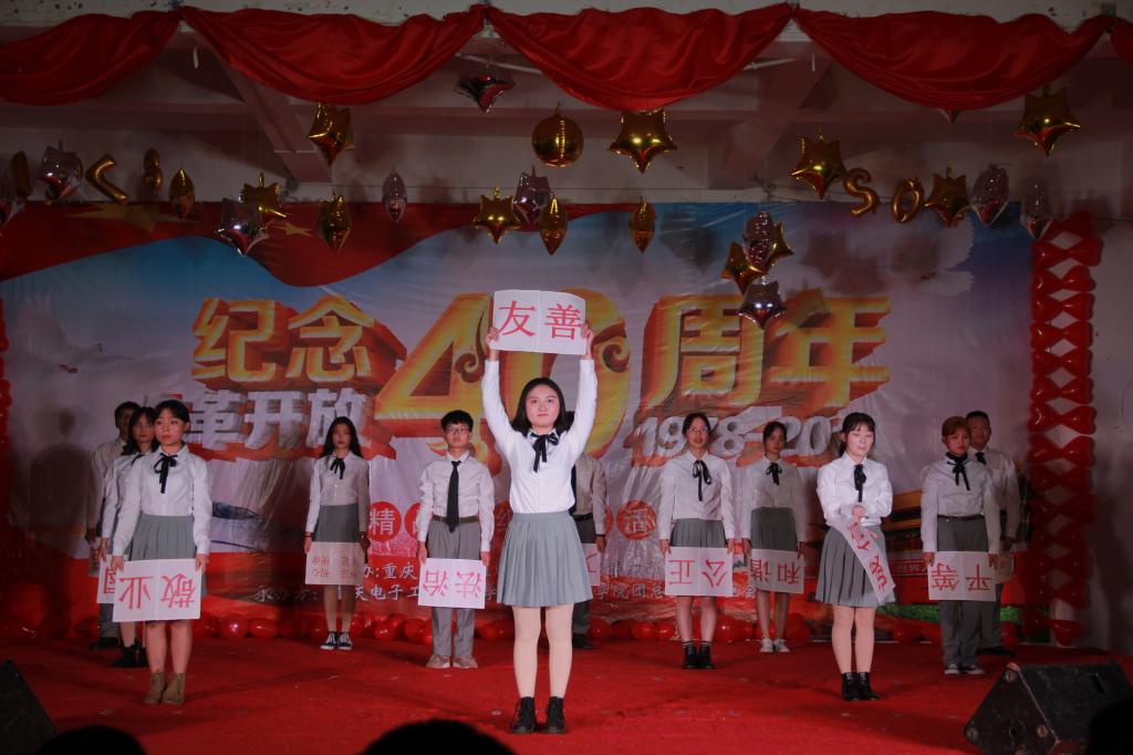全体起立奏唱团歌之后,汪书记现场致辞,号召青年大学生不忘初心、牢记使命,献礼新征程。活动就“改革开放成就、改革开放进程、全面深化改革、改革进行到底”四个篇章进行节目展示。《走向复兴》歌舞,展示了大学生对新生活充满了无限希望,《new life《筷子文化》小品,将中华五千年华夏文明的精髓加以展示和倡导。节目类型多样,个个精彩纷呈。通过观赏节目,改革开放进程的艰辛,改革开放成就的辉煌,都一一呈现于眼前。