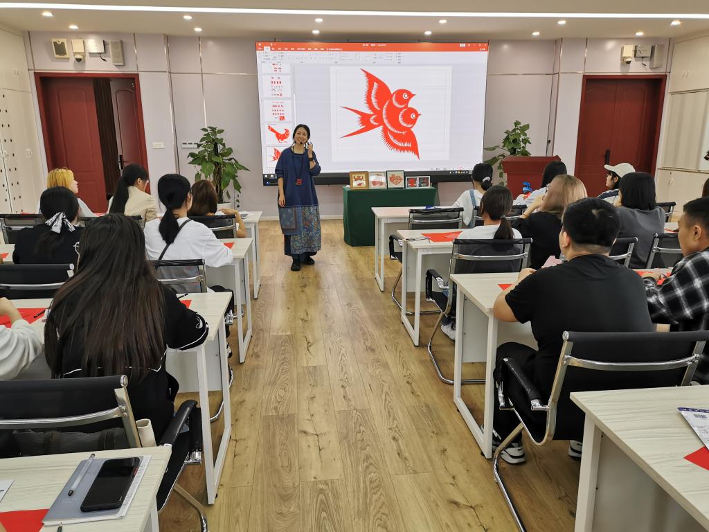 在本次培训中杨艺老师通过“剪纸照片”把同学们带入浓厚的剪纸氛围中,讲解了中国吉祥代表物之一“喜鹊”、剪纸的方法和剪纸历史,并展示了精美的剪纸作品。杨老师先示范后指导,手把手与同学们一起剪纸。整个过程生动有趣,国家非物质文化遗产磅礴的创造力、民族性深深融入了同学们的心中。