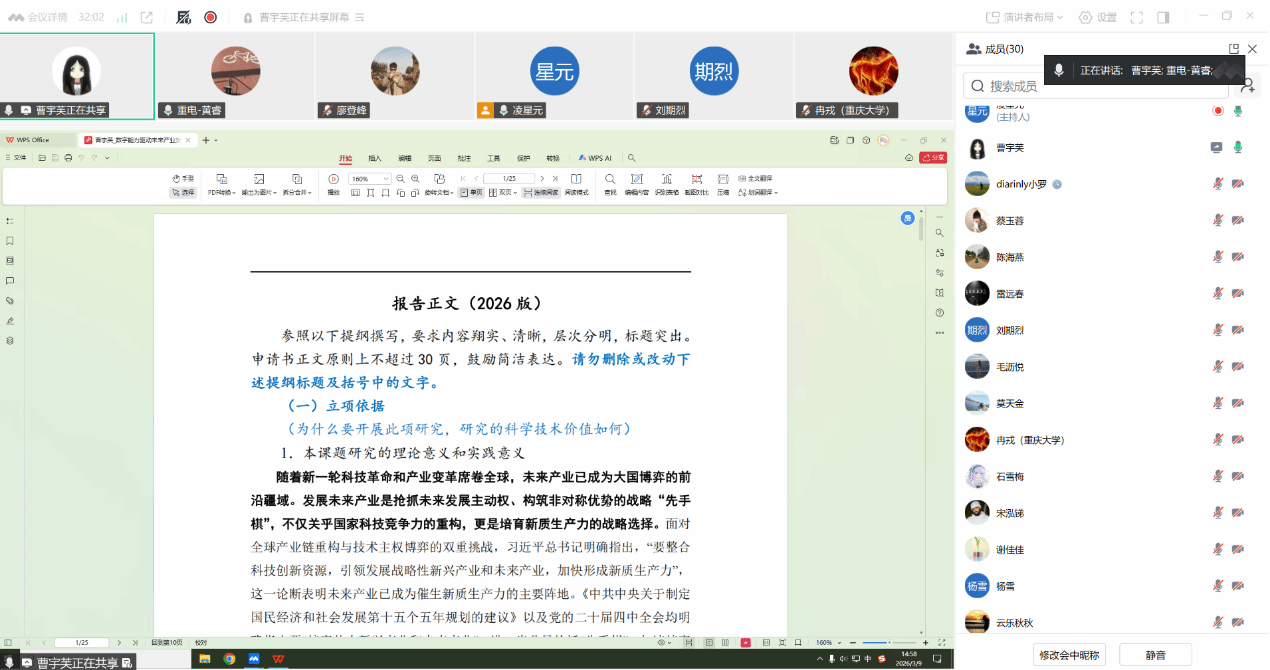 2026年3月9日,为进一步夯实有组织科研基础,助力教师精进申报材料,数字经济与管理学院通过腾讯会议组织第三轮国家级科研项目申报论证会。会议特邀重庆大学冉戎教授、重庆邮电大学刘期烈教授(二级)担任点评专家。学院院长黄睿、科研骨干及青年教师代表30余人参加会议。论证会由学院科研管理科负责人凌星元博士主持。