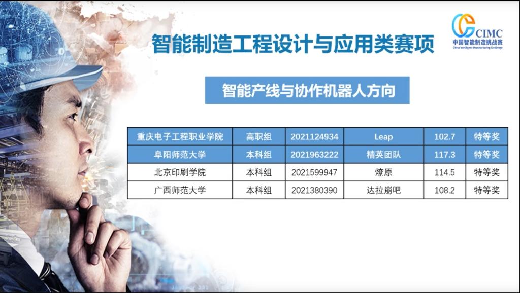 11月15日,2021年教育部第十五届CIMC“西门子杯”中国智能制造挑战赛(以下简称CIMC大赛)全国总决赛圆满落幕。由我校财经管理学院智能物流专业学生周远航、张家辉和蒋原欢组成的参赛队伍,在“智能产线与协作机器人方向”赛项中勇夺第一名,获全国总决赛特等奖(高职组),由组委会颁发奖杯,指导教师汪启航和李智博获优秀指导教师奖。