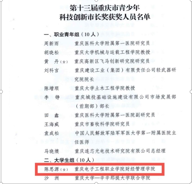 为深入学习贯彻习近平总书记关于科技创新的重要论述,鼓励全市职业青年、大学生、中小学生积极参与科技创新活动,促进青少年科技创新后备人才培养,营造热爱科学、崇尚创新的社会氛围。重庆市人民政府经在全市范围遴选、评审、考察,最终决定授予30人第十三届重庆市青少年科技创新市长奖。我校财经管理学院市场营销专业2019级学生陈思源获得表彰。这是我校学生首次获得该奖项。