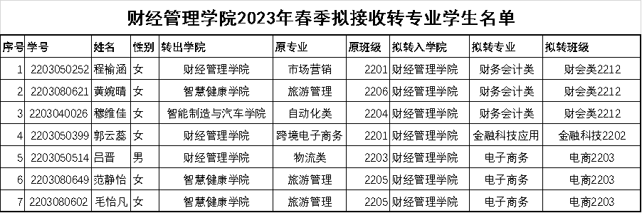 根据《重庆电子工程职业学院学生转学转专业管理办法》和《财经管理学院转专业实施方案》的相关规定,对7名提出转专业(转入)申请的同学进行了学院资格初审、面试考核等环节,根据转专业工作小组考核结果,经学院党政联席会综合审定,同意程榆涵等7名同学转专业(转入),现将拟接收名单公示如下: