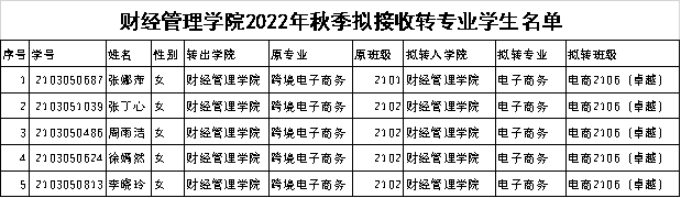 根据《重庆电子工程职业学院学生转学转专业管理办法》和《财经管理学院转专业实施方案》的相关规定,结合转出、转入学院的审核(考核)意见,经财经管理学院党政联席会综合审定,同意张娜萍等5名同学转专业(转入),现将拟接收名单公示如下: